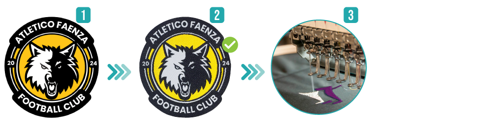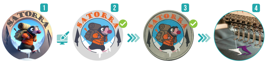 Pour de petites modifications (ou si le fichier est déjà correct), notre atelier intervient directement, sans frais supplémentaires. Une fois votre fichier (1) chargé, vous recevrez un échantillon photographique de votre patch (2)  à valider avant de lancer la production (3).