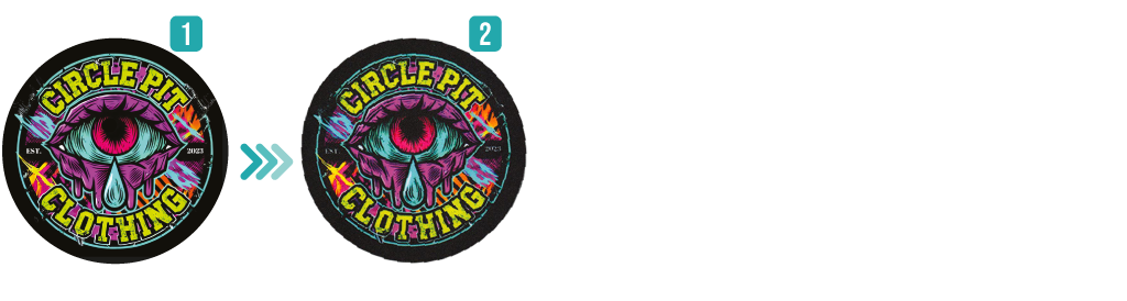 Si vous souhaitez conserver intact votre projet (1), la solution idéale est la patch sublimée, impression directe sur tissu, qui permet une reproduction plus fidèle (2) et sans compromis.